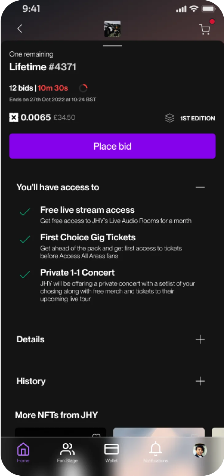You can earn tokens and collectables for supporting your favourite artists. Show them off on your profile or sell or trade them with other fans on our marketplace. The rarest ones will give you VIP benefits within an artist’s community and access to real-life experiences.